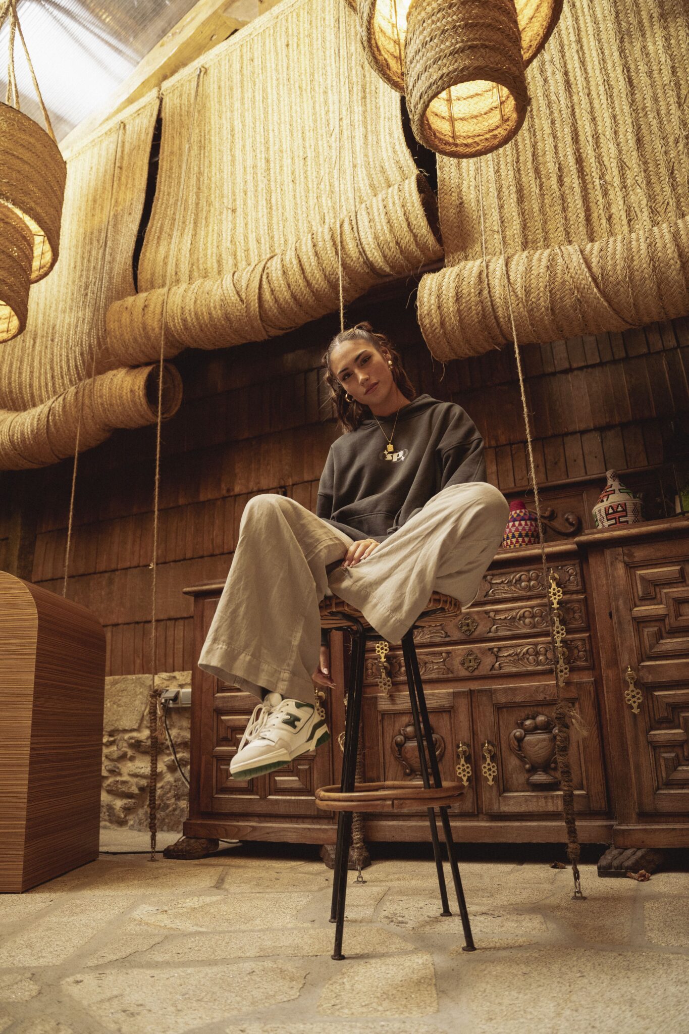 Nuestras composiciones fusionan prendas espaciosas con arquitectura rústica. Creamos retratos naturales que transmiten actitud urbana auténtica.